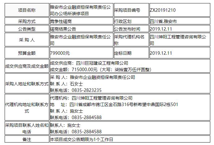 雅安市企業(yè)融資擔(dān)保有限責(zé)任公司辦公場所裝修項(xiàng)目競爭性磋商結(jié)果公告