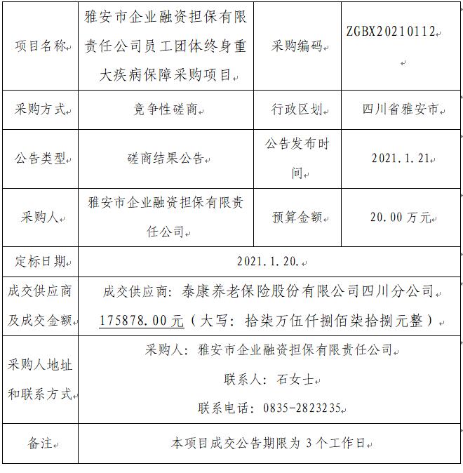員工團體終身重大疾病保障采購項目競爭性磋商結(jié)果公告